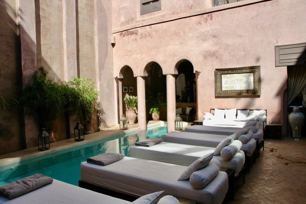 But when you arrive at your hotel a new world is waiting for you. Hotels in the medina are usually so-called riads. These are courtyard mansions hiding behind metre-thick walls blocking out all the street noise and they are oases of calm. You will find there gardens with palm trees and fountains, quite a lot of the riads have also a swimming pool, really a heaven on earth.